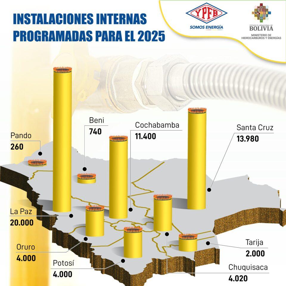 En el marco del Sistema de Distribución de Gas Natural, la estatal petrolera programó la construcción de 20.000 instalaciones internas en el departamento de La Paz, 13.980 en Santa Cruz, 11.400 en Cochabamba, 4.020 en Chuquisaca, 4.000 en Potosí, 4.000 en Oruro, 2.000 en Tarija, 740 en Beni y 260 conexiones internas que serán construidas en el departamento de Pando.