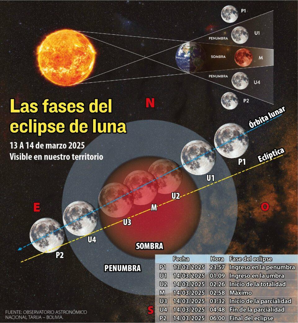 De acuerdo con su publicación, cerca de la medianoche del jueves 13 empezará el proceso con un ingreso a la penumbra. En tanto, que el pico máximo, en que la Luna estará por completo eclipsada, será a las 02.58 del viernes 14, según la hora boliviana. (Revisar infografía).