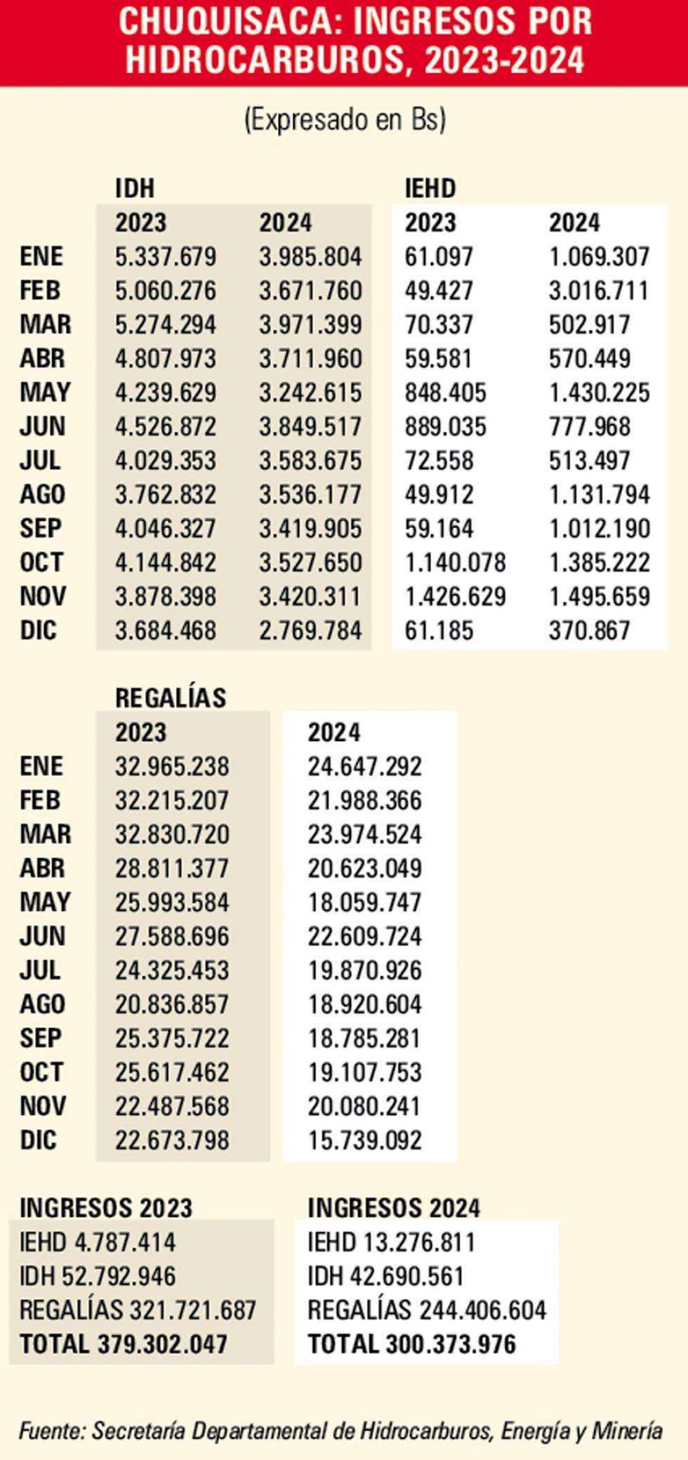 Mucho peor fue el comportamiento de las regalías, que es la principal fuente de ingresos, pues la Gobernación de Chuquisaca recaudó Bs 77 millones menos en 2024 con relación a 2023.