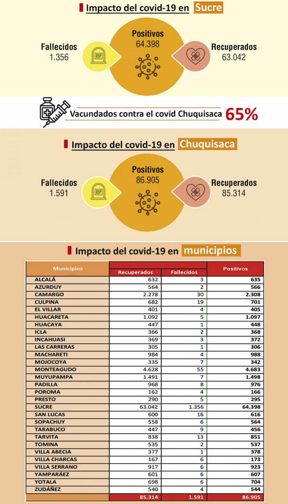 Sucre fue el epicentro de la tragedia y concentró la mayor cantidad de decesos, con 1.356 víctimas. Sin embargo, la pandemia no perdonó a ningún municipio de Chuquisaca y todos lamentaron al menos una pérdida humana.