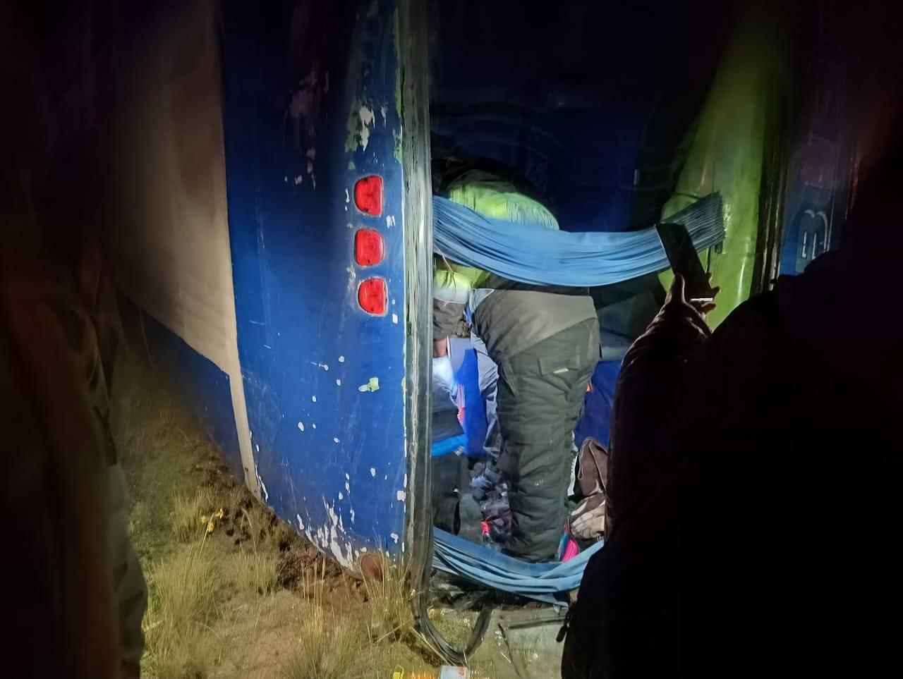 La aparente colisión del ómnibus con un camión provocó, en primera instancia, que se desvíe del camino y al salir del asfalto volcó con los pasajeros a bordo, mientras que el conductor del camión se dio a la fuga.