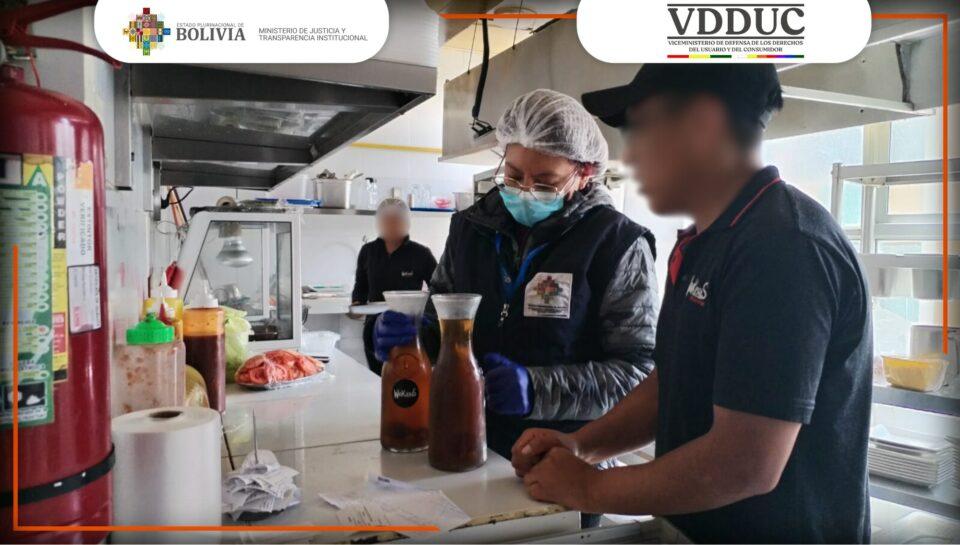 “El VDDUC llevó a cabo un operativo de control de precios e inocuidad en un patio de comidas situado en la calle Raúl Salmón (El Alto). En la inspección, se constató la presencia de productos en mal estado, tales como carne de pollo y res en descomposición, así como botellas de jugo que contenían partículas extrañas”, señala una nota de prensa.