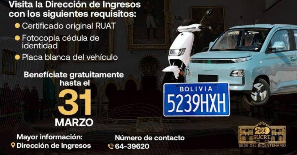 “Invitamos a quienes tengan estos vehículos y estas placas blancas (que) puedan hacer el cambio; simplemente es ir y hacer el cambio de placa blanca por la azul”, explicó Claudio Zurita, secretario Administrativo de la Alcaldía, en contacto con Correo del Sur Radio (FM 90.1 y AM 980).