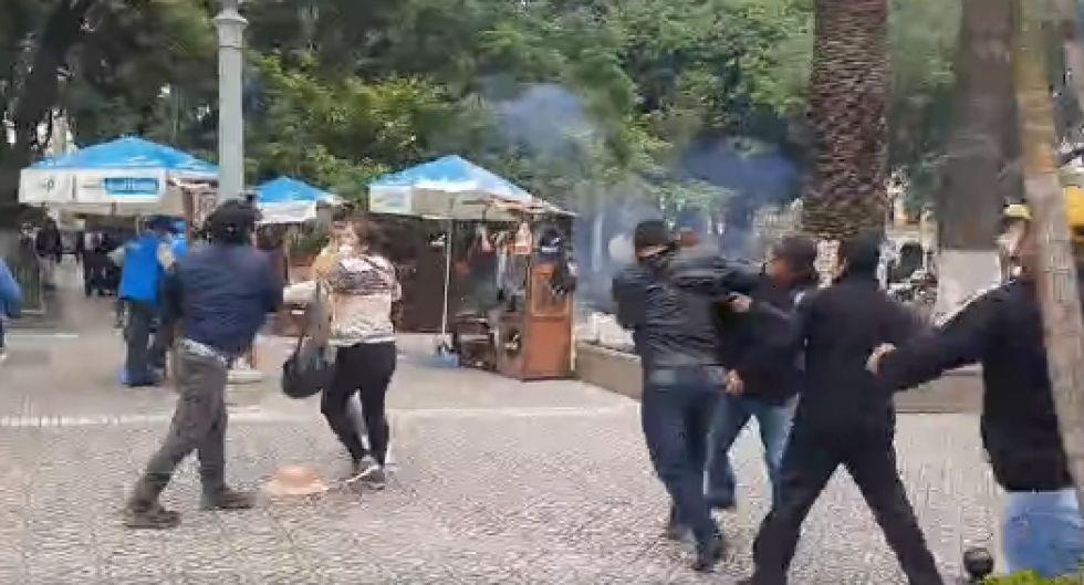 Imágenes difundidas en redes sociales y que fueron captadas por los propios manifestantes muestran intensas discusiones entre ambos bandos, quienes además se lanzaron petardos y cohetes como forma de protesta.