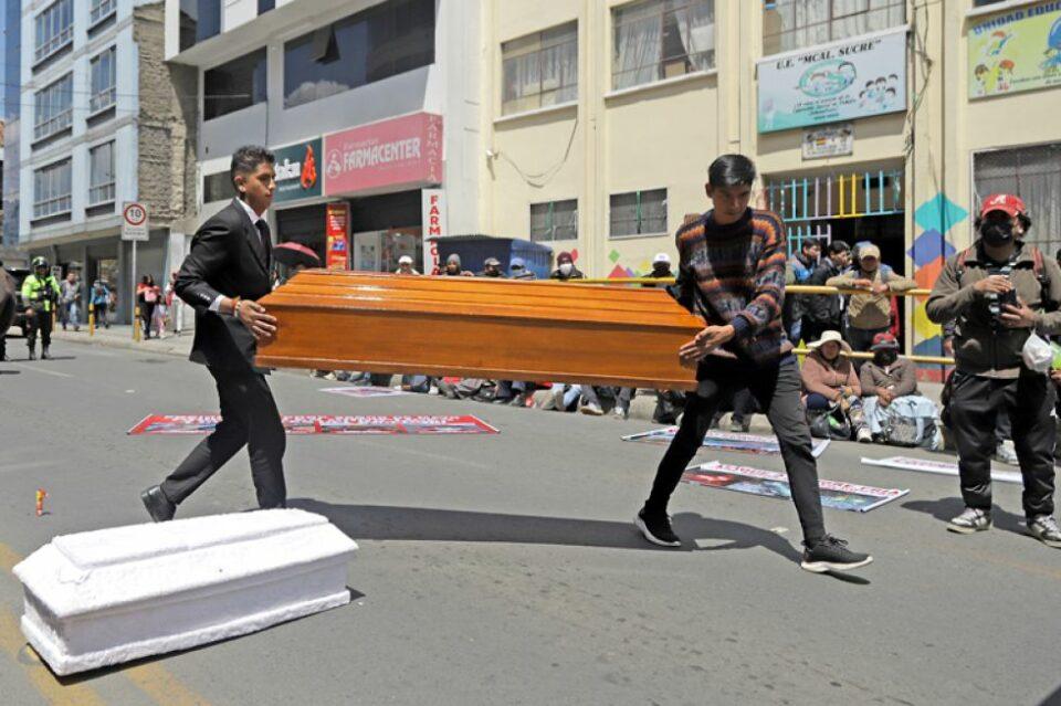 Mineros auríferos y familiares de cinco personas que fallecieron en una explosión protestaron este lunes colocando ataúdes vacíos frente a las sedes de la Federación Nacional de Cooperativas Mineras y la Fiscalía, en La Paz, y exigieron que se capture a quienes ellos consideran responsables del atentado.
