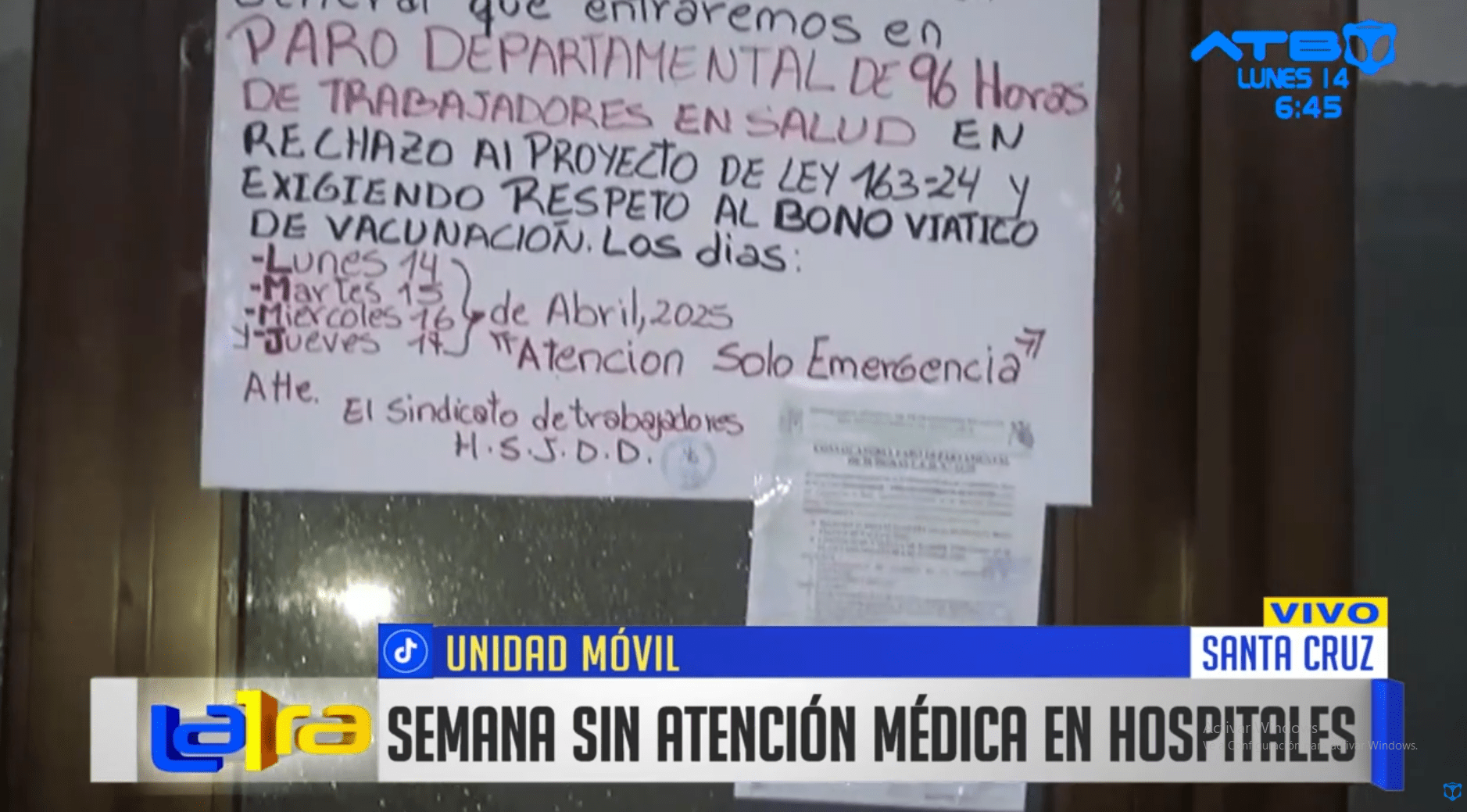 Santa Cruz, 14 de abril 2025 (ATB Digital).- Con carteles pegados en las puertas de los centros de salud, médicos de la ciudad de Santa Cruz iniciaron un paro de 96 horas, dejando sin atención a los pacientes en los hospitales públicos. La medida fue asumida en protesta contra la Ley 163 y en demanda del respeto al bono viático de vacunación. Los pacientes expresaron su malestar ante la suspensión de los servicios médicos, ya que muchos de ellos aseguran haberse visto seriamente afectados. Algunos incluso relataron que pasaron la noche en las puertas del centro médico con la esperanza de ser atendidos.
