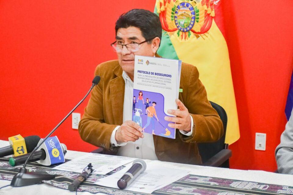 En una conferencia de prensa realizada este lunes, el ministro Omar Veliz anunció que la decisión fue tomada en coordinación con el Comité Intersectorial de Análisis Epidemiológico en Salud. “El Ministerio de Educación ha emitido un instructivo a los directores departamentales, distritales y a los directores de unidades educativas para que apliquen los protocolos de bioseguridad y así prevenir las infecciones respiratorias agudas en niñas, niños, adolescentes y jóvenes”, señaló la autoridad.