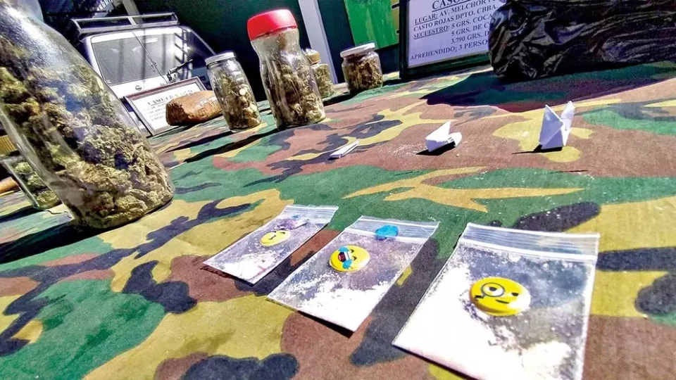 Durante el operativo, los efectivos aprehendieron a tres personas y secuestraron las siguientes sustancias: 1.090 gramos de marihuana en una bolsa, 2.700 gramos en frascos, cinco gramos de “tusi” y cinco gramos de clorhidrato de cocaína.