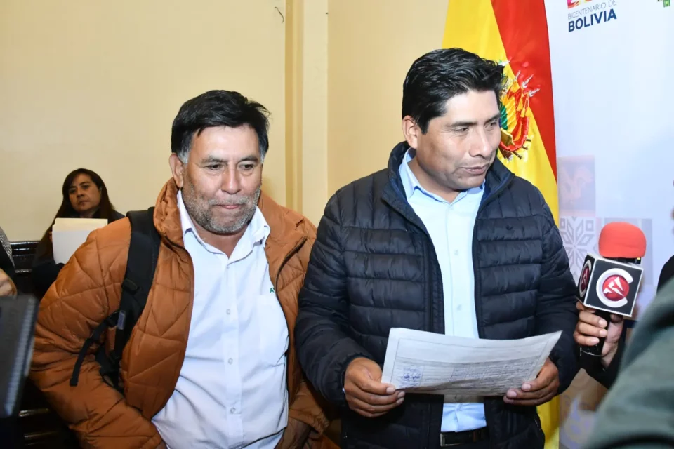 El viceministro en ejercicio de Comercio y Logística Interna, Luis Murillo, y el gerente de Emapa, Franklin Flores, asistieron a la reunión con los dirigentes de los productores.