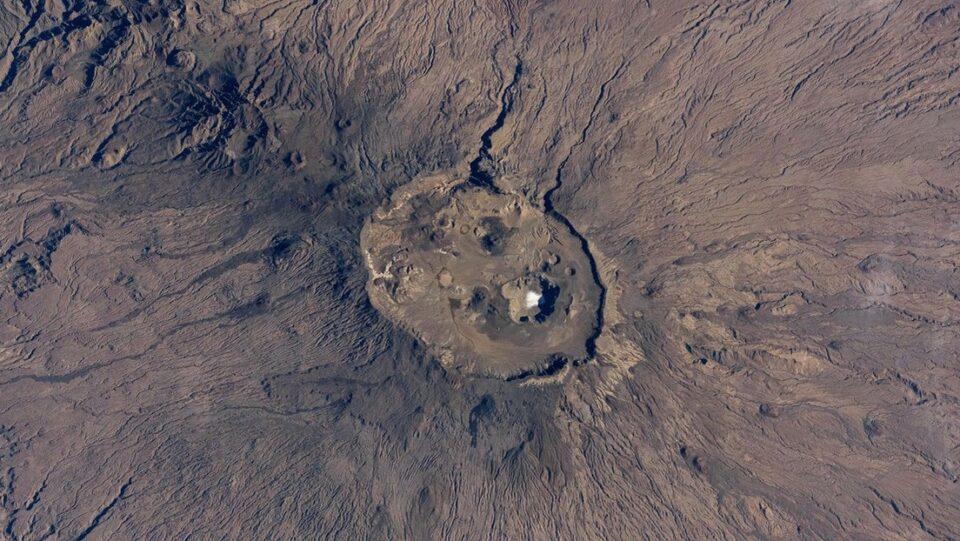 La imagen, tomada el 29 de diciembre del año pasado, se enfoca en la cima del Emi Koussi, donde se aprecia una caldera elíptica que alberga un antiguo lago seco cubierto de sal, ubicado en su punto más bajo, a unos 745 metros por debajo del pico. El círculo blanco resalta sobre los tonos oscuros de los antiguos flujos de lava que cubren sus laderas.