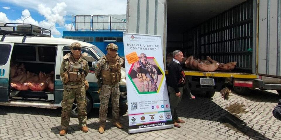 “Hasta la fecha tenemos importantes resultados en el control del contrabando de carnes, tenemos 13.840 kilos de carne de cerdo, 77.000 kilos de carne de res y 10.150 kilos de carne de cordero , lo cual constituye un duro golpe a la actividad ilícita que afecta la economía nacional”, detalló Pardo en una entrevista con Bolivia Tv.