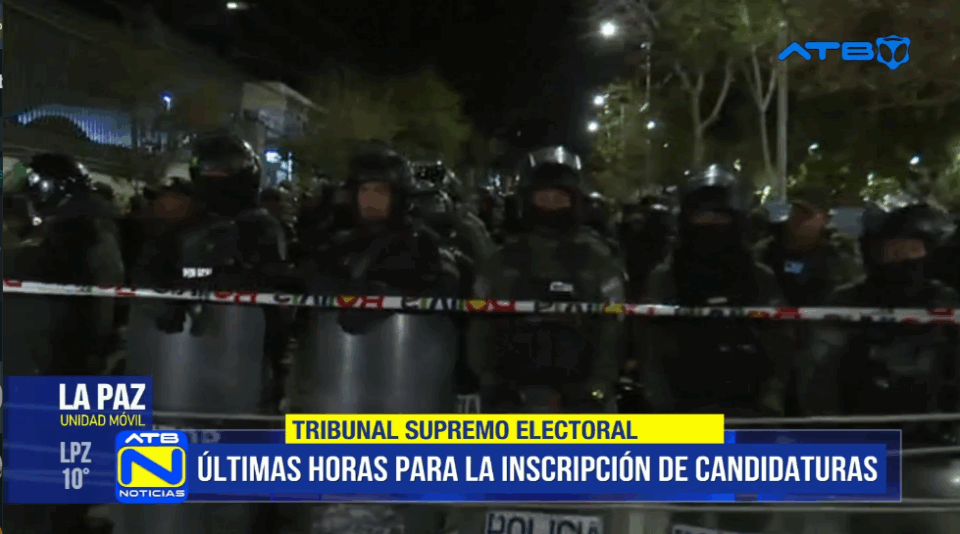 La Paz, 19 de mayo (ATB Digital) .- A pocas horas de que venza el plazo para la inscripción de candidaturas rumbo a las elecciones generales de agosto, la sede del Tribunal Supremo Electoral (TSE), ubicada en la plaza Abaroa, registra una intensa actividad y un fuerte resguardo policial.