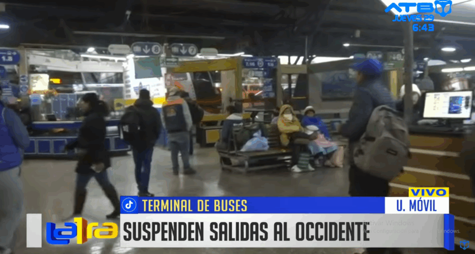 Cochabamba, 29 de mayo 2025 (ATB Digital).- Las salidas hacia el occidente del país fueron suspendidas este miércoles desde la Terminal de Buses de Cochabamba, debido a bloqueos registrados en distintos puntos de la ruta. La oficina de Tránsito de la terminal instruyó a las empresas de transporte paralizar los viajes, como medida preventiva ante los bloqueos reportados a la altura de Pirque y Llavini. Según la información, estas manifestaciones fueron iniciadas por seguidores de Evo Morales, lo que ha generado complicaciones en la circulación vehicular.