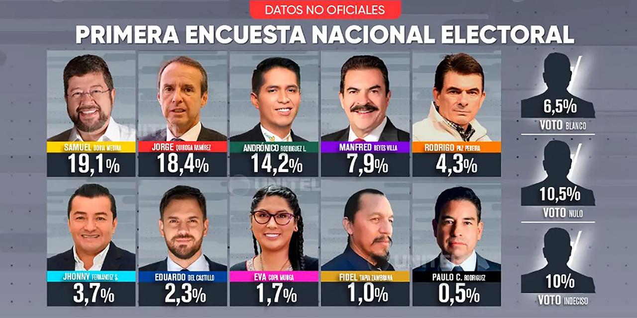 La red Unitel publicó la primera encuesta electoral de cara a las elecciones generales, elaborada por Ipsos Ciesmori, en la que el empresario Samuel Doria Medina, con 19,1% de intención de voto, lleva una leve ventaja a Jorge Tuto Quiroga, que está con 18,4%.