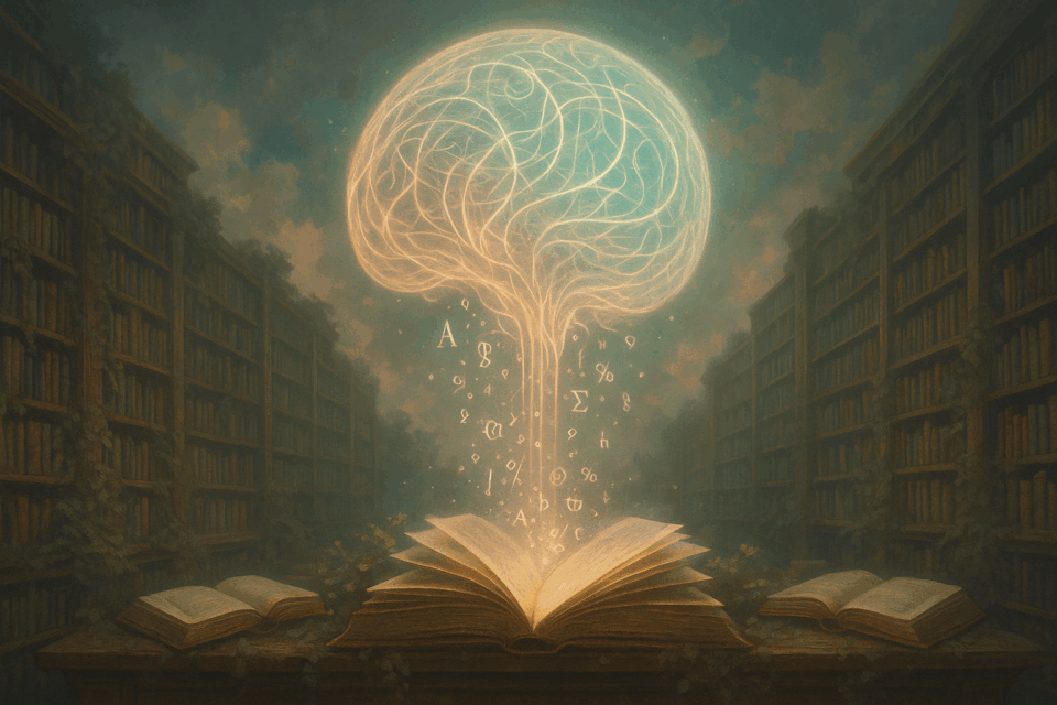 Mundo, 8 junio 2025 (ATB Digital).- Ilustracion-surrealista-de-una-inteligencia-artificial-nacida-de-libros-de-dominio-publico-con-una-esfera-luminosa-flotando-sobre-una-biblioteca-antigua-cubierta-de-vegetacion