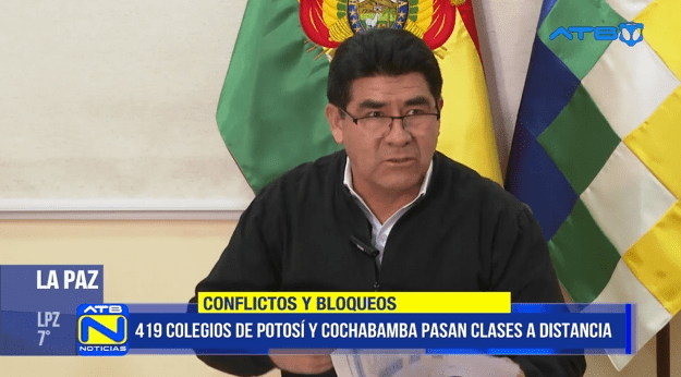 La Paz, 10 de jun 2025 (ATB Digital).- En los departamentos de Cochabamba y Potosí, un total de 418 unidades educativas estarían pasando clases virtuales, según informó el ministro de Educación, Omar Veliz. La autoridad atribuyó esta situación a los bloqueos registrados en ambas regiones y cuestionó duramente a quienes obstruyen las vías, afectando el desarrollo del calendario escolar.