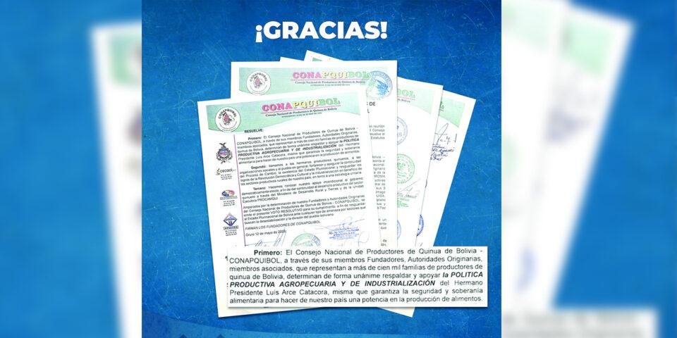 “A nuestras hermanas y hermanos del Consejo Nacional de Productores de Quinua de Bolivia, muchas gracias por su firme y permanente respaldo. En unidad con nuestras organizaciones sociales vamos a seguir trabajando para fortalecer nuestra economía nacional y garantizar la seguridad con soberanía alimentaria del país”, escribió el Jefe de Estado.