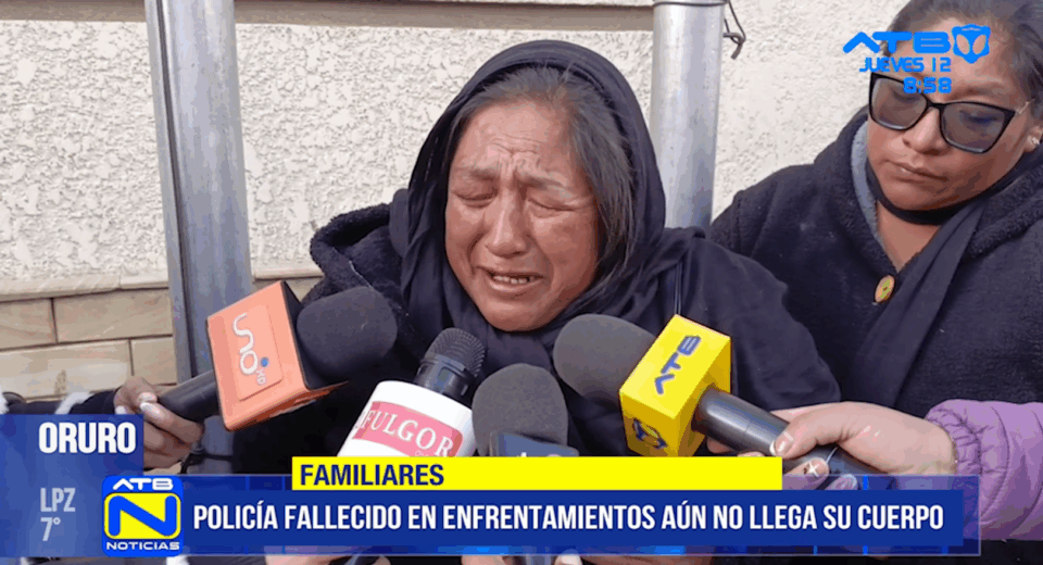 Oruro, 12 junio 2025 (ATB Digital).—En puertas del Comando Departamental de la Policía en Oruro, doña Marta Rodríguez —madre del teniente Brayan Barrozo— implora entre lágrimas que las autoridades permitan el traslado del cuerpo de su hijo. Brayan es el primer efectivo policial fallecido en los recientes enfrentamientos violentos registrados en el municipio de Llallagua.