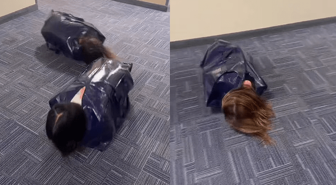 La escena, digna de una comedia universitaria, parecía desarrollarse con las reglas del juego claras: los participantes debían impulsarse con las rodillas dentro del bolso, avanzando paso a paso. Sin embargo, la creadora del video decidió salirse del molde —literalmente— y empleó una táctica que la catapultó al triunfo (y a la viralidad): en vez de avanzar con movimientos cortos, comenzó a rodar dentro del bolso, transformándose prácticamente en un cilindro humano.