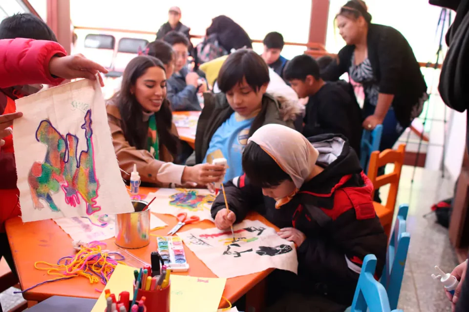 En el taller, Panozo mostró a los niños obras icónicas del arte boliviano y les enseño no sólo la manipulación de materiales como los pinceles y las paletas, también ornamentaciones en lana.