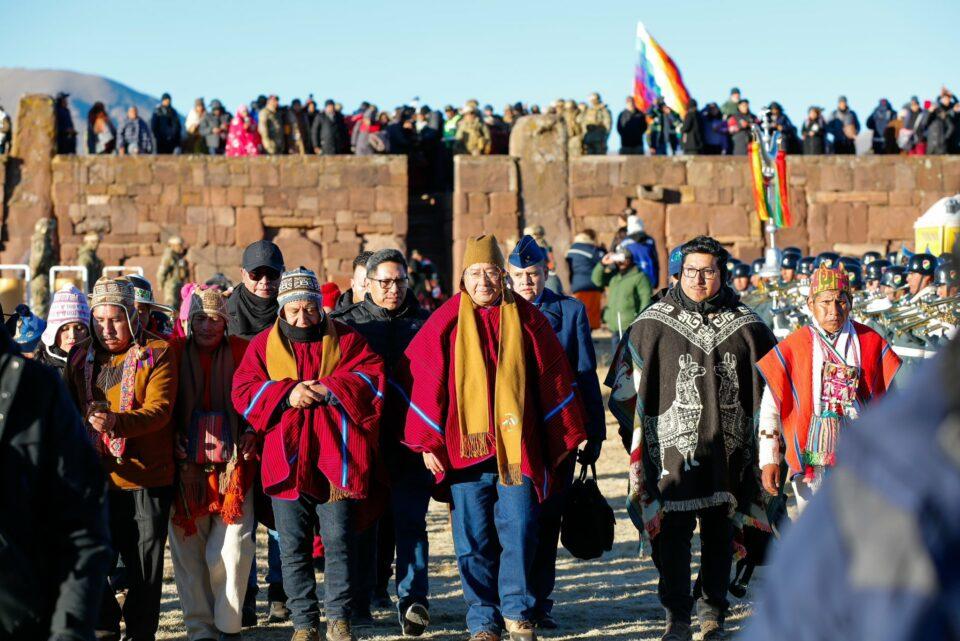 La autoridad hizo las declaraciones tras recibir los primeros rayos del sol en el templo de Kalasasaya, del ancestral municipio de Tiwanacu, ubicado a 70 kilómetros de la ciudad de La Paz, acompañado por el vicepresidente del Estado, David Choquehuanca; la ministra de Culturas, Esperanza Guevara; y el presidente de la Cámara de Diputados, Omar Yujra; además de las autoridades regionales y de las organizaciones sociales.