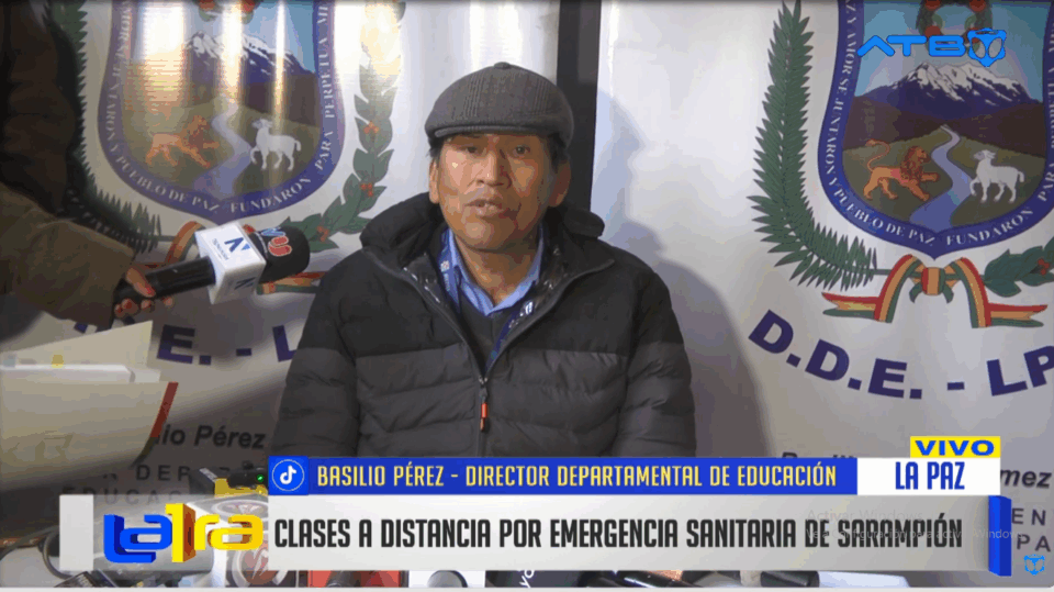 La Paz, 25 de junio 2025 (ATB Digital).- Basilio Pérez, director departamental de Educación, informó que las clases en la ciudad de La Paz pasarán a la modalidad a distancia debido a la emergencia sanitaria provocada por el brote de sarampión. La medida entrará en vigencia a partir de este miércoles tanto en La Paz como en El Alto, y se mantendrá hasta nuevo aviso. El objetivo principal es evitar posibles contagios masivos, luego de que se confirmaran dos casos positivos de la enfermedad en la ciudad de El Alto.