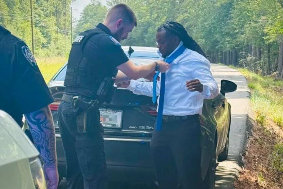 El incidente fue registrado el pasado domingo 22 de junio y el momento quedó captado en una fotografía del oficial justo cuando toma la corbata del conductor para hacer el nudo.
