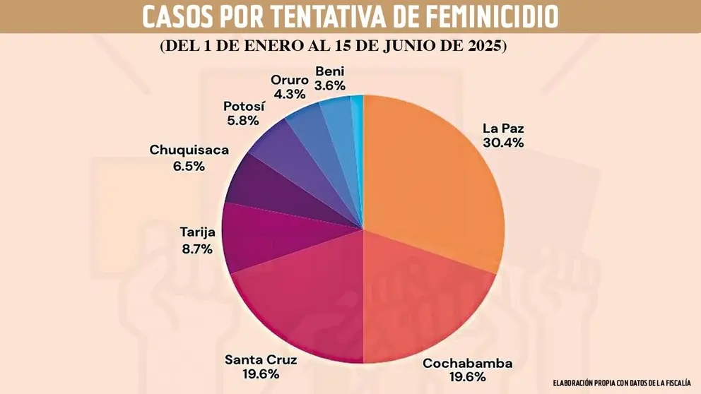 Según datos estadísticos de la Fiscalía General del Estado (FGE), entre el 1 de enero y el 15 de junio de 2025 se registraron 138 casos de tentativa de feminicidio en Bolivia. La distribución por departamento es la siguiente: 42 en La Paz, 27 en Cochabamba, 27 en Santa Cruz, 12 en Tarija, 9 en Chuquisaca, 8 en Potosí, 6 en Oruro, 5 en Beni y 2 en Pando.