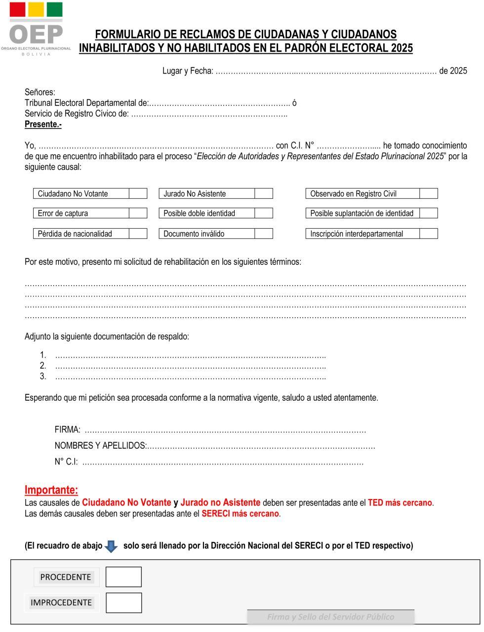 “La ciudadanía va a poder presentar sus reclamos correspondientes con la finalidad de que sean rehabilitados y puedan participar del proceso de elecciones generales”, remarcó este martes en un medio local, el director departamental del Serecí, Ronald Roca.