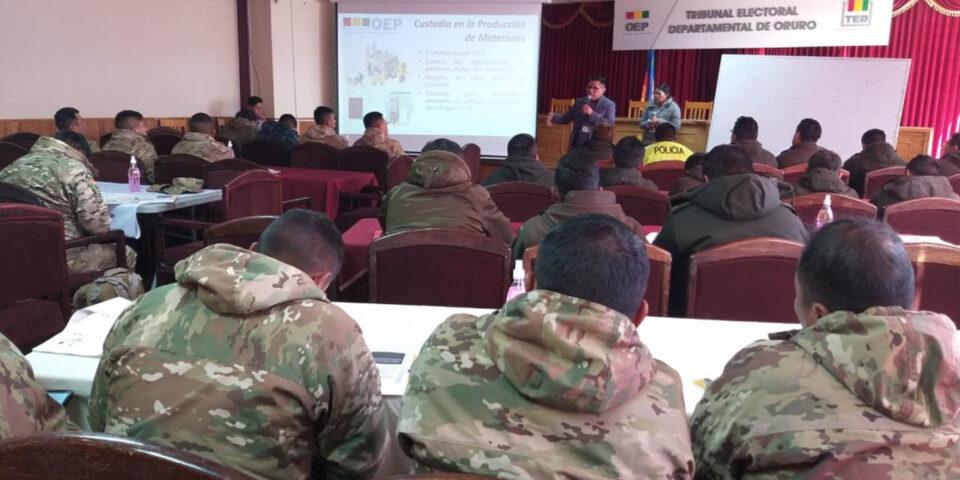 El taller se desarrolló en el auditorio del TED Oruro y contó con la participación de personal policial y militar, quienes recibieron información técnica detallada por parte de un especialista de la DNPE sobre la logística, responsabilidades y componentes de la cadena de custodia antes, durante y después de la jornada electoral.