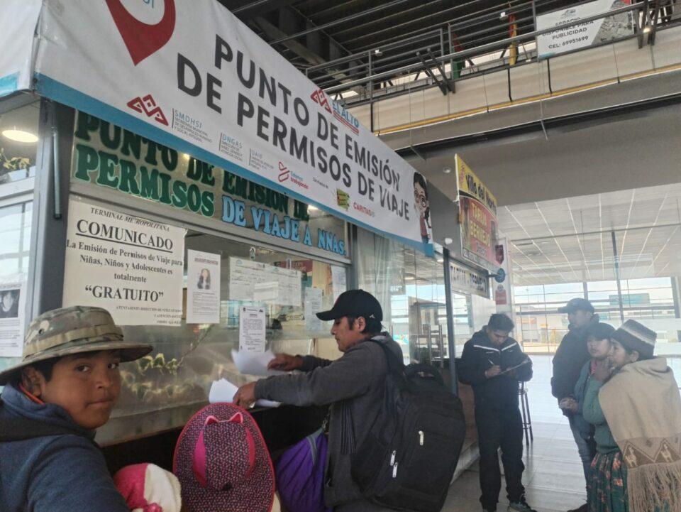 El Alto, 4 julio 2025 (ATB Digital).— Con el objetivo de garantizar un viaje seguro para niñas, niños y adolescentes por vacaciones de invierno, la Terminal Metropolitana de El Alto, en coordinación con instituciones implementa la campaña “Viaje Seguro”, que refuerza los puntos de control, verificación de documentos, vacunación.