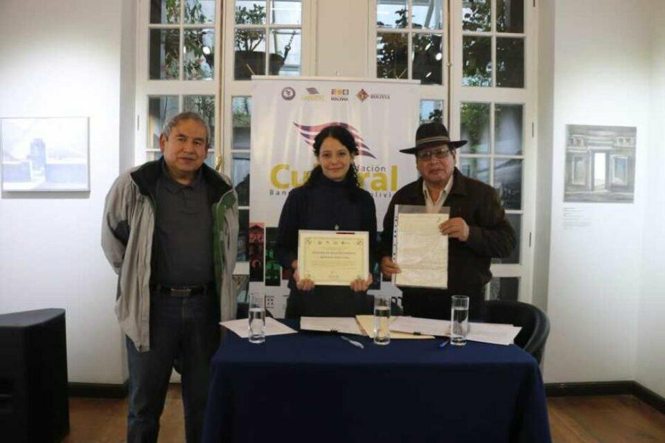 En el acto, la FC-BCB entregó un Certificado de Reconocimiento a la artista plástica por la donación del documento familiar.