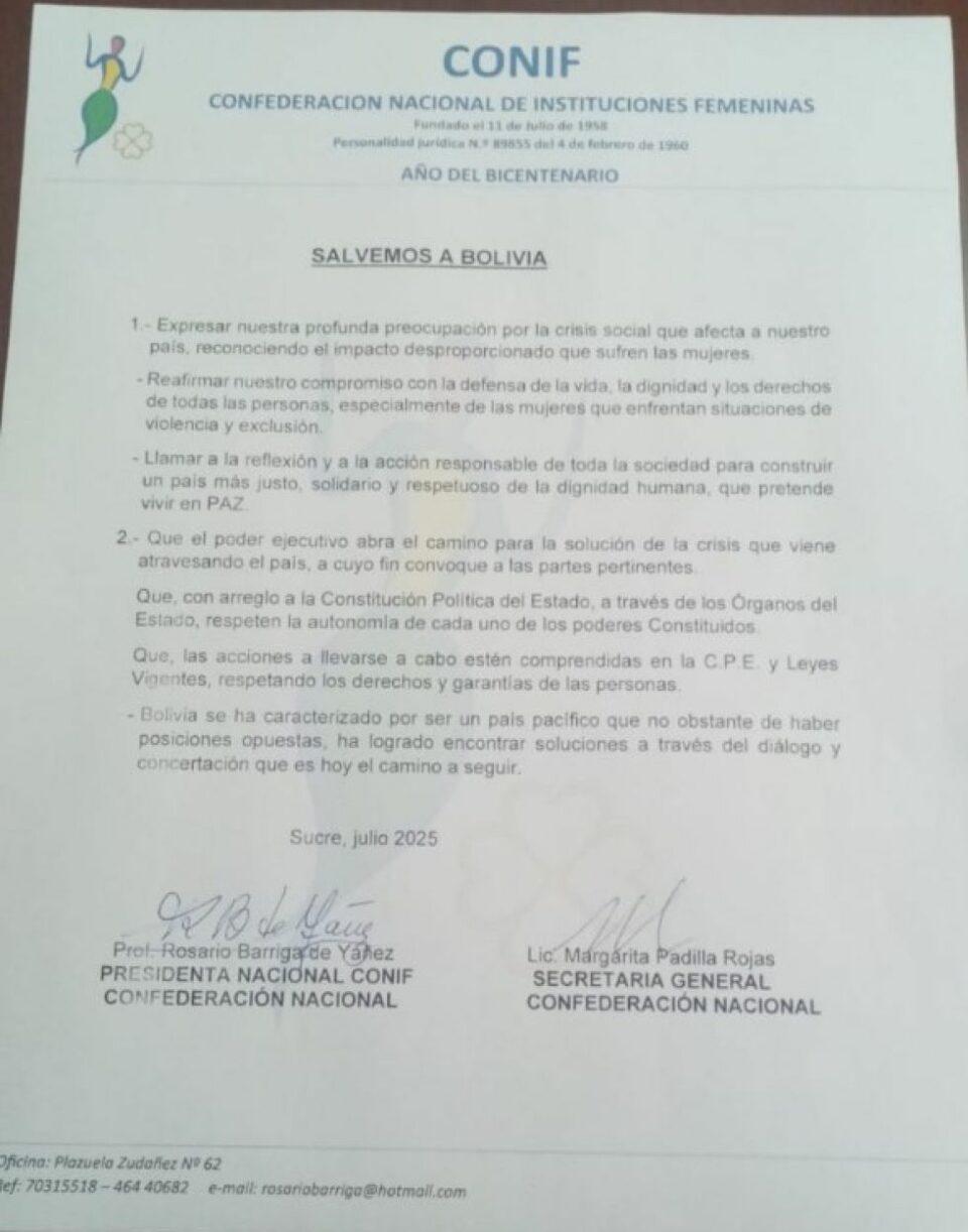 “Bolivia se ha caracterizado por ser un país pacifico que no obstante de haber posiciones opuestas, ha logrado encontrar soluciones a través del diálogo y concertación que es hoy el camino a seguir”, señala el pronunciamiento firmado por la presidente y la secretaria general de Conif, Rosario Barriga y Margarita Padilla, respectivamente.