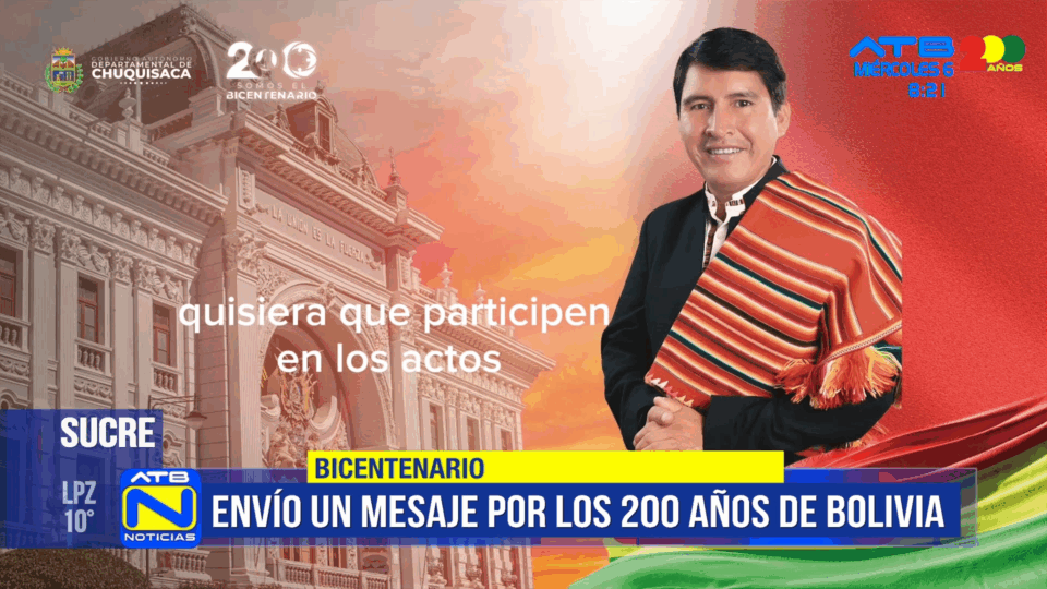 Chuquisaca, 06 de ago 2025 (ATB Digital).- El gobernador de Chuquisaca, Damián Condori, compartió un emotivo mensaje en conmemoración a los 200 años de independencia de Bolivia. Desde su recuperación médica, saludó al pueblo boliviano y dio la bienvenida a las delegaciones que llegaron a Sucre, capital del país. Condori expresó su deseo de volver pronto “con más fuerzas” y cerró su mensaje con un sentido “¡Que viva Bolivia!”.