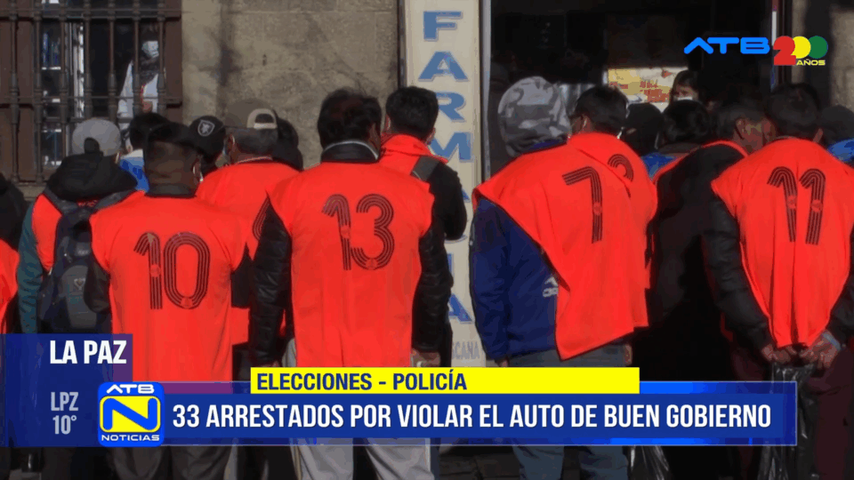 La Paz, 16 de ago 2025 (ATB Digital).- La Policía Boliviana reportó que alrededor de 33 personas infringieron el Auto de Buen Gobierno. La institución recalcó que se controlarán a los motorizados que circulen sin el permiso correspondiente durante la jornada electoral. Además, informó que aproximadamente 8.000 efectivos fueron desplegados en La Paz para garantizar las elecciones generales.
