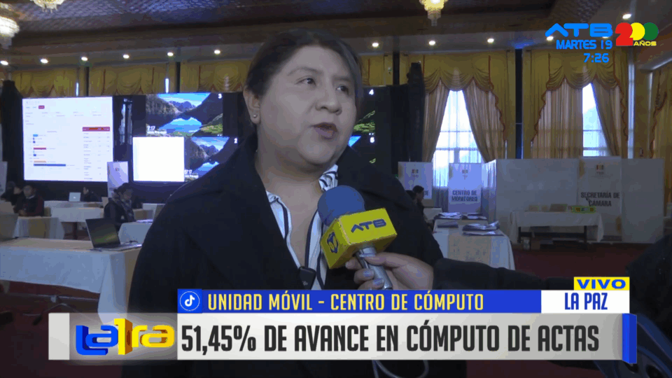 La Paz, 19 de ago 2025 (ATB Digital) .- Desde el centro de monitoreo del Tribunal Supremo Electoral (TSE), Gisela Pérez, vocal del Tribunal Electoral Departamental (TED) de La Paz, informó que el 51,45% de actas ya fueron contabilizadas. Ayer se alcanzó el 45% y el trabajo avanza con actualizaciones al mediodía y en la noche. Aún falta recepcionar el 8,4% de actas, principalmente del norte paceño (Iturralde, Apolo, Mapiri), que se prevé lleguen entre hoy y mañana.