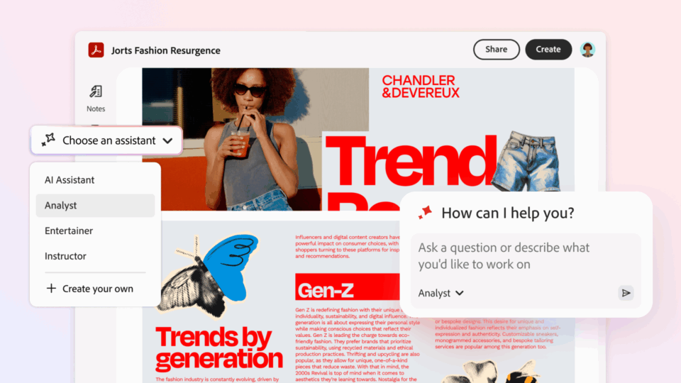 Uno de los pilares de Acrobat Studio son los Espacios PDF, una funcionalidad que permite agrupar archivos PDF, páginas web y otros recursos en un entorno compartido, interactivo y potenciado por asistentes de IA. Estos asistentes no solo responden preguntas, sino que pueden adoptar roles como “analista”, “instructor” o incluso “animador”, adaptando su lenguaje y estilo a las necesidades de cada usuario.