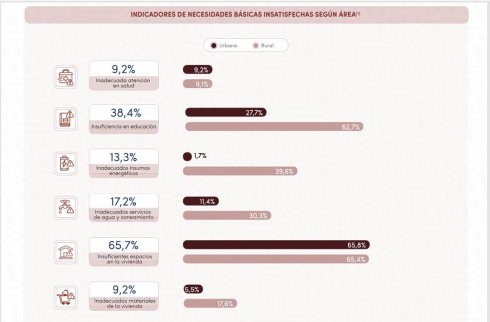 La medición de la pobreza por NBI incluye seis dimensiones que reflejan la calidad de vida de la población: Materiales de la vivienda, mejoraron de forma sostenida, sobre todo en áreas urbanas; espacios en la vivienda, es el indicador más crítico, más del 65% de la población sufre hacinamiento o carece de espacios adecuados; servicios de agua y saneamiento, cobertura en expansión, aunque las deficiencias rurales persisten.