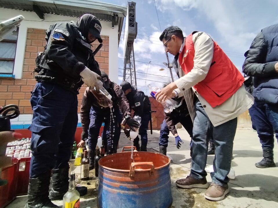 Entre los productos decomisados se encontraban bebidas elaboradas de forma artesanal o envasadas sin cumplir la normativa legal, sin precintos ni autorización del SENASAG, lo que las hacía impropias para el consumo humano.