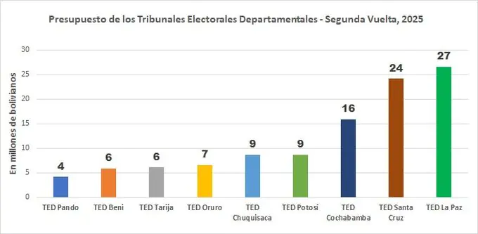 «El presupuesto asignado a los nueve Tribunales Electorales Departamentales (TEDs) para esta segunda vuelta del domingo 19-O (octubre), día del balotaje, es de 107 millones de bolivianos», informó el vocal a través de su cuenta de X.