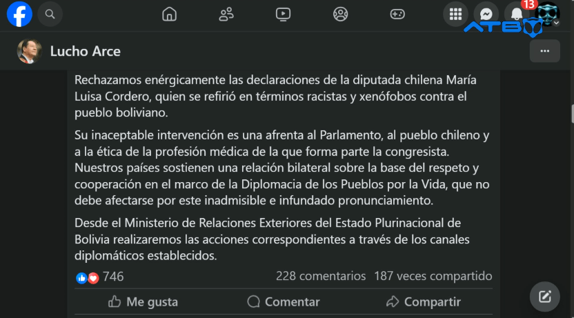 La Paz, 11 de sep 2025 (ATB Digital).- El presidente del Estado, Luis Arce, rechazó enérgicamente las declaraciones de la diputada chilena María Luisa Cordero, quien se refirió de manera despectiva hacia el pueblo boliviano. El mandatario calificó sus expresiones de racistas y xenófobas.