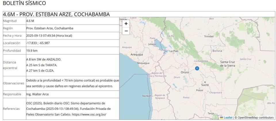 Cochabamba, 13 de sep 2025 (ATB Digital).- La Red Sismológica del Observatorio San Calixto informó que “el día 13 de septiembre de 2025 a horas 07:49:34 (local) registró un evento de magnitud 4.6 M, a una profundidad hipocentral de 19.9 km (sismo superficial)”. El epicentro fue ubicado en la provincia Esteban Arze, en el departamento de Cochabamba.