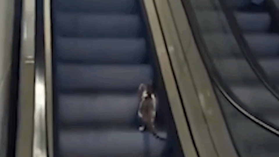Transeúnte ayuda a gato que eligió la escalera mecánica equivocada