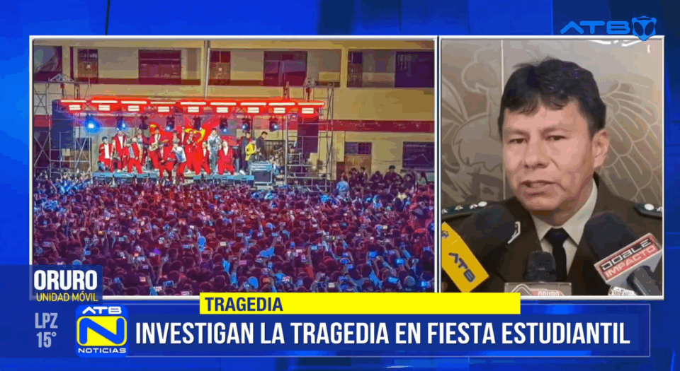 Oruro, 22 de sep 2025 (ATB Digital)-. Una adolescente de 16 años falleció y su prima resultó afectada durante una fiesta escolar realizada el 21 de septiembre en Oruro, donde se presentaba el grupo “Sangre Cumbiera”. La menor fue trasladada al Hospital Obrero, pero perdió la vida en terapia intensiva. El comandante departamental, Gonzalo Torrico, informó que la directora del colegio fue aprehendida por no contar con autorización de la Distrital y también un integrante del grupo musical, mientras continúan las investigaciones para identificar a más responsables.