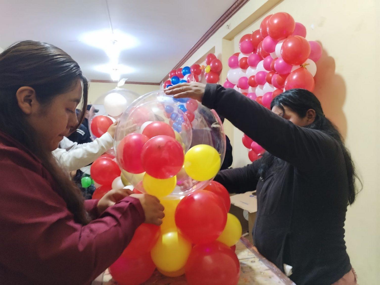 El curso combina teoría y práctica y actualmente se dicta el módulo de Globomanía, donde aprenden a manipular distintos tipos de globos y armar bouquets. Más adelante aprenderán florería, mantelería y piñatería, todo lo que forma parte de la decoración de eventos, explicó Esli Canqui, profesora del curso.