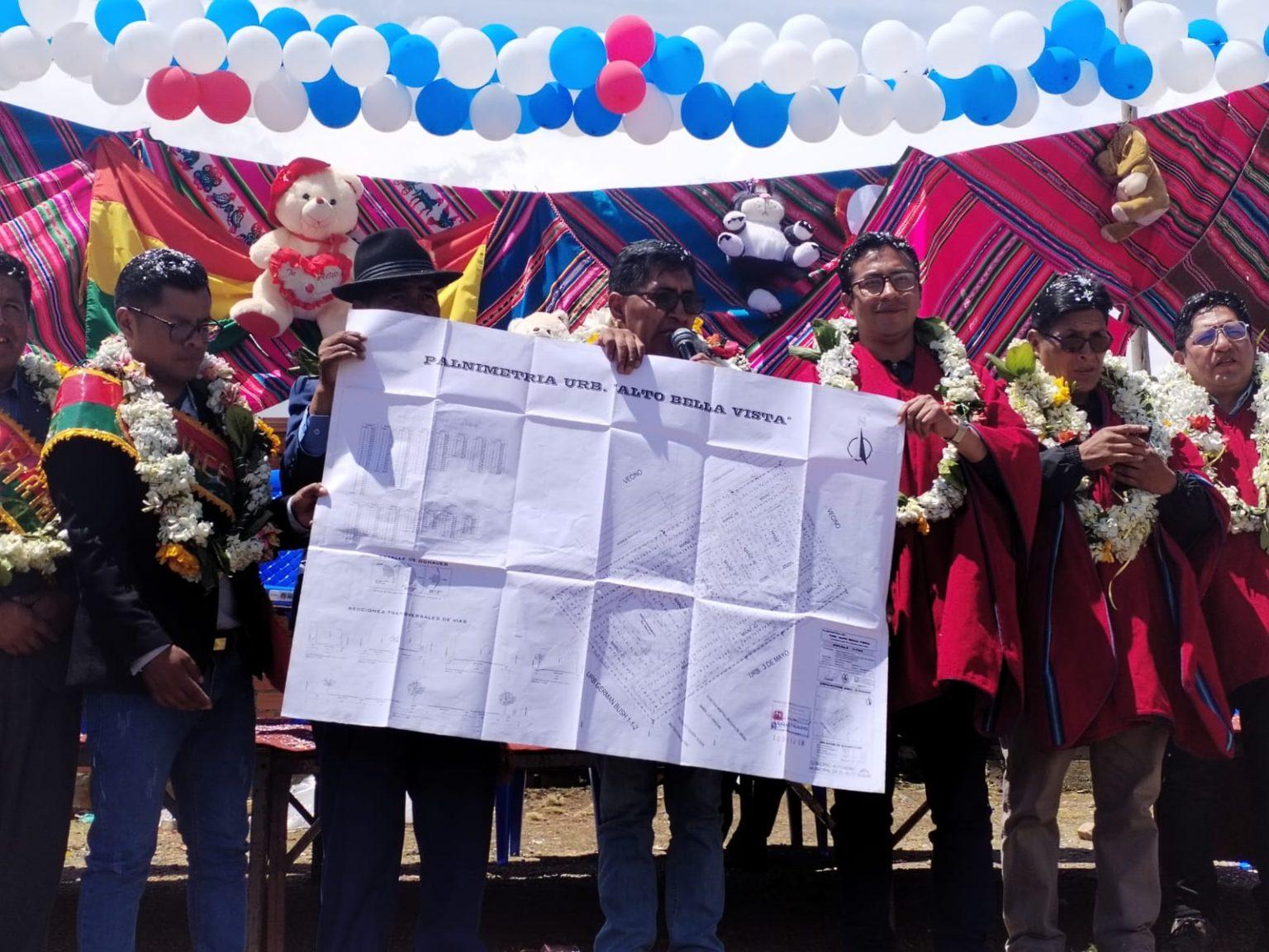 «Gracias a la hermana alcaldesa Eva Copa hemos concluido nuestro trámite de planimetría, han sido 14 años de espera, por eso hoy es un día histórico», señaló Humberto Cutili, presidente de la Urbanización Alto Bella Vista.