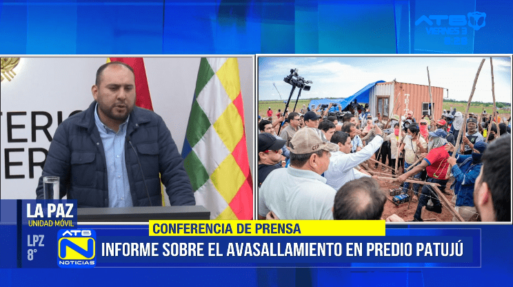 La Paz, 03 de oct 2025 (ATB Digital).-El ministro de Gobierno, Roberto Ríos, informó este viernes que un operativo policial con más de 500 efectivos, apoyado por el Servicio Aéreo Policial, permitió liberar a las personas retenidas y retomar el control del predio Patujú, en Montero. La intervención se realizó tras la ocupación del terreno por grupos de avasalladores, en medio de un clima de tensión y hechos violentos registrados en la zona.