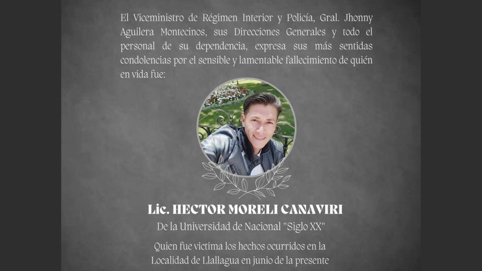 La Paz, 06 de oct 2025 (ATB Digital).- Falleció Héctor Moreli, el universitario que fue agredido por sectores afines a Evo Morales en los violentos bloqueos en Llallagua, Potosí, a finales de junio. El Viceministerio de Régimen Interior y Policía dio a conocer el deceso en un comunicado.