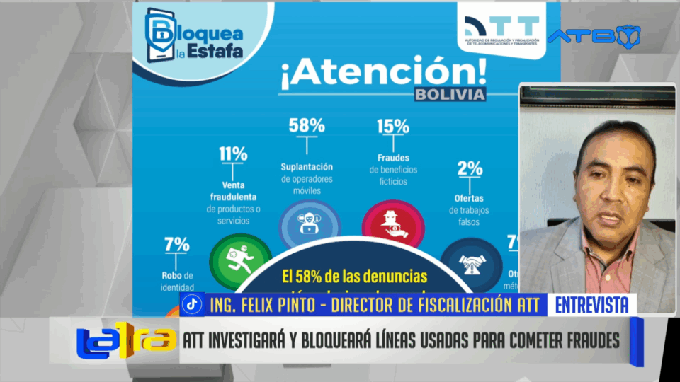 La Paz, 07 de oct 2025 (ATB Digital).- El director de Fiscalización de la Autoridad de Regulación y Fiscalización de Telecomunicaciones y Transportes (ATT), Félix Pinto, presentó una nueva plataforma destinada a proteger a los usuarios y prevenir fraudes digitales en Bolivia.