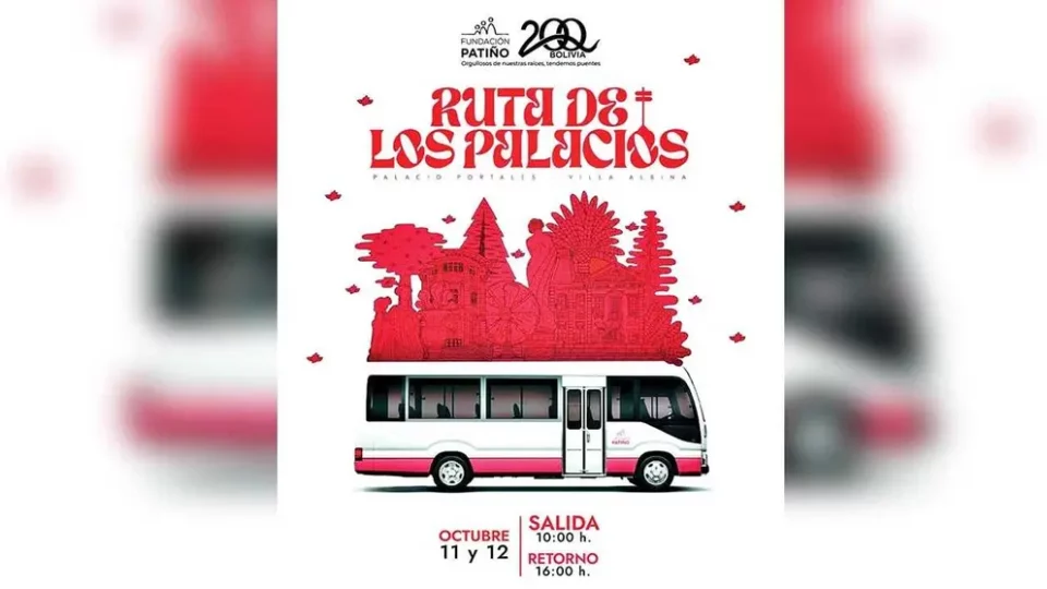 La Paz, 07 de oct 2025 (ATB Digital).- La Fundación Simón I. Patiño organiza este sábado y domingo la ‘Ruta de los Palacios’, un recorrido cultural que permitirá a los visitantes conocer dos de los hitos más emblemáticos de Cochabamba y Pairumani: el majestuoso Palacio Portales y la encantadora Villa Albina. La actividad incluye visitas guiadas, tiempo libre para recorrer jardines y la opción de un brunch en la cafetería Typica, con un itinerario que va de 10:00 a 16:00. Los boletos tienen un costo de 65 bolivianos y se pueden adquirir online; los menores de 5 años que no ocupen asiento en el bus ingresan gratis.